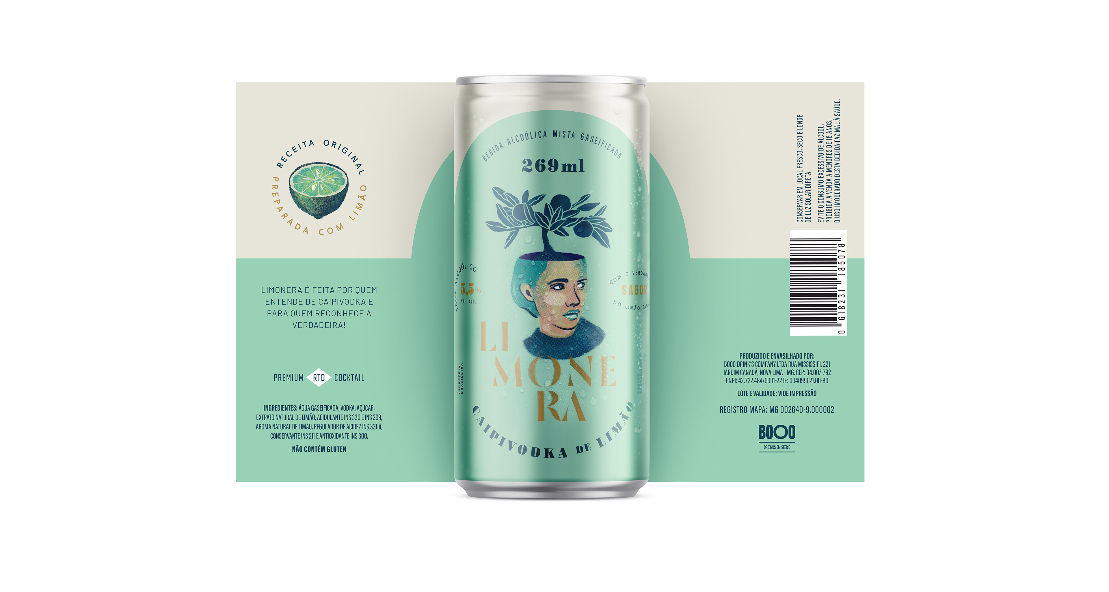 Limonera é uma caipivodka em lata, e seu projeto gráfico destaca o sabor do limão - o ingrediente principal dessa receita. A ilustração coloca ênfase na qualidade natural da bebida, mostrando o frescor do ingrediente ainda no limoeiro.